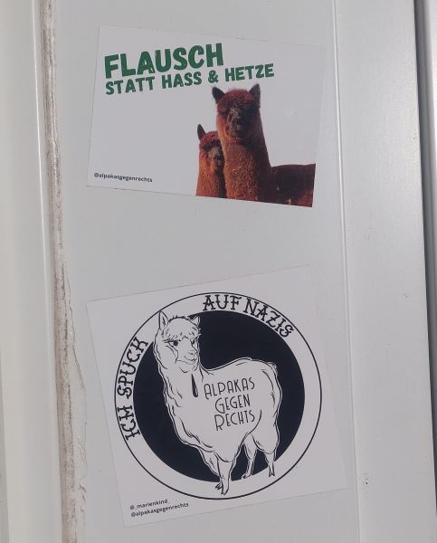 Auch an und in unserer Flauschbox zeigen wir Nazis und ihren Anhängern den Stinkefinger! Es bleibt dabei: Alle Gewinne aus den Verkäufen unserer Kategorie Alpakas gegen rechts spenden wir an Initiativen, die sich für mehr Demokratie und gegen Rechtsextremismus einsetzen!