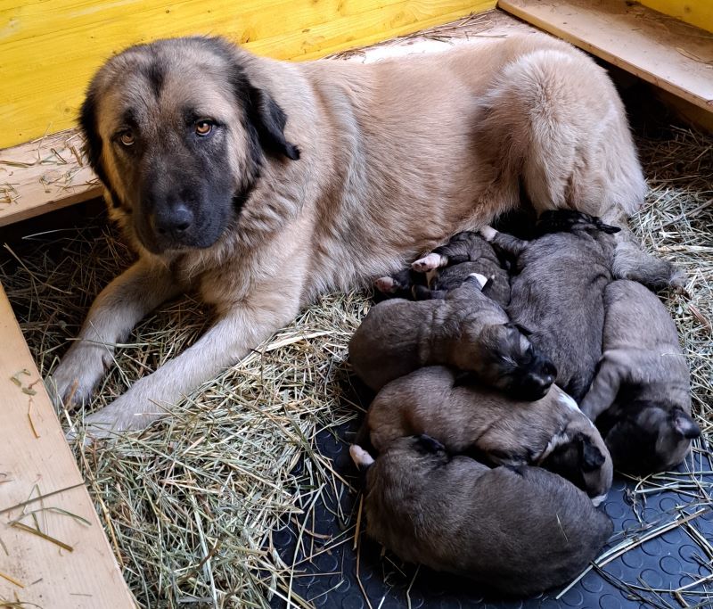 Und dann waren da noch die Welpies, die in den letzten Tagen vor Weihnachten noch mal einen ordentlichen Entwicklungsschub mitmachten. Von fünf von ihnen sollten wir uns noch verabschieden. Sie bereiten sich nun bei Andrea, der Herdenschutzhundeexpertin unseres Vertrauens, auf ihren weiteren Werdegang vor. Gladys da auf dem Foto wird sich nun als Herdenschützerin für Alpakas vorbereiten und lernt schon fleißig von Mama Dunja.