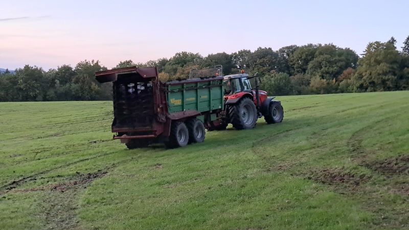 Martin kam ganz pünktlich heim… denn just an diesem Tag beschlossen unsere Lohnunternehmerherren unseres Vertrauens, es wäre ein sehr guter Tag fürs Mistfahren. Denn, wir erinnern uns… unser Miststreuer hatte ja im Frühjahr den Geist aufgegeben und wir haben noch keine Ersatzteile für ihn gefunden, weil der schon sehr alt und lange nicht mehr hergestellt wird. Für einen neuen Miststreuer fehlt aktuell das Geld und so fragten wir mal ganz vorsichtig bei Jan-Lukas und Benedikt und hey, ho… sie erklärten sich bereit den Mist für uns zu fahren. Und so kam also der (für unsere Verhältnisse) echt riesige Miststreuer und fuhr den Mist der Flauschs auf die Heuwiese. Hachz!