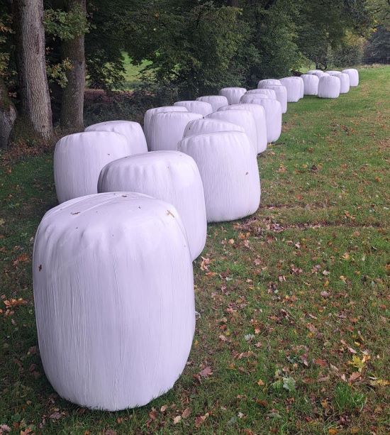 Und diese 28 kleineren Ballen sind nun gut verpackt als Siloballen und werden unsere Stuten im Winter gut versorgen. Juhuuu. Da stehen sie also… als kleine Dino-Eier… auf unserer Heuwiese. Sobald Jan-Lukas oder Benedikt mal noch Zeit haben, werden sie noch fein säuberlich in der Hofeinfahrt gestapelt, damit wir da im nassfeuchten Winter die Wiese nicht kaputtfahren bzw. überhaupt an die Ballen kommen.